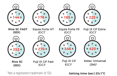 Different clinical scenarios demand different setting times. Riva Self Cure Fast Set offers the fastest setting time for when a quick procedure is required. If more time is needed, Riva Self Cure offers the ideal time-frame for working with comfort and confidence.