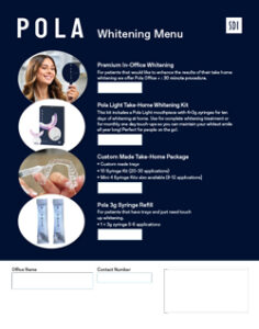 Download and customise the Pola take home whitening menu that can be given to your patients.
